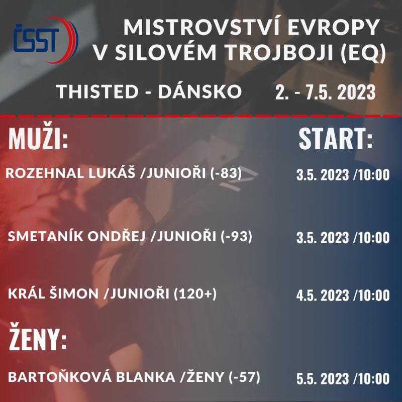 Ve dnech 2. - 7. května 2023 se v dánském Thistedu představí čtveřice českých reprezentantů na Mistrovství Evropy mužů, žen, juniorů a mladších juniorů v silovém trojboji EQ.